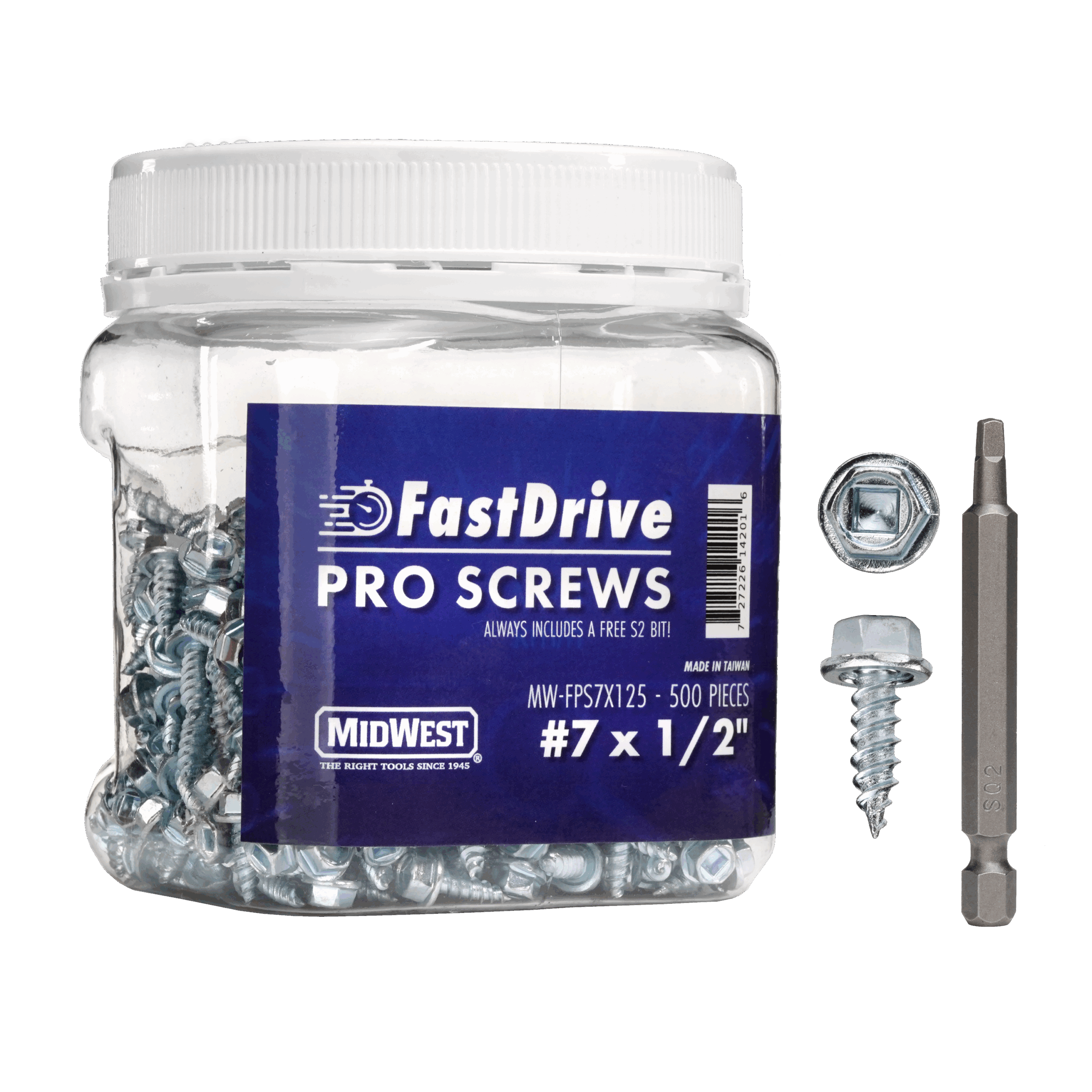 Midwest Tool FastDrive Pro Screws are a game-changer for professionals. The unique combination of a Twin lead thread design combined with To-the-Tip threads and the extended tapered tip all combined to facilitate extremely fast and efficient driving. The S2 Combo-Hex Head allows the installer to choose between using use a standard hex head bit or the sure grip of a S2 Square-Drive bit. The S2 bit offers unmatched grip and superior reach in tight environments. The hex head has a recessed washer face, providing a flush surface for a clean finish and stability. The screws are zinc-plated, providing corrosion resistance for durability and longevity. No more struggling – the FastDrive Pro Screws are engineered for convenience.MW-FPS7X12150 #7 x 1/2-in FastDrive Screw (15,000pcs case)